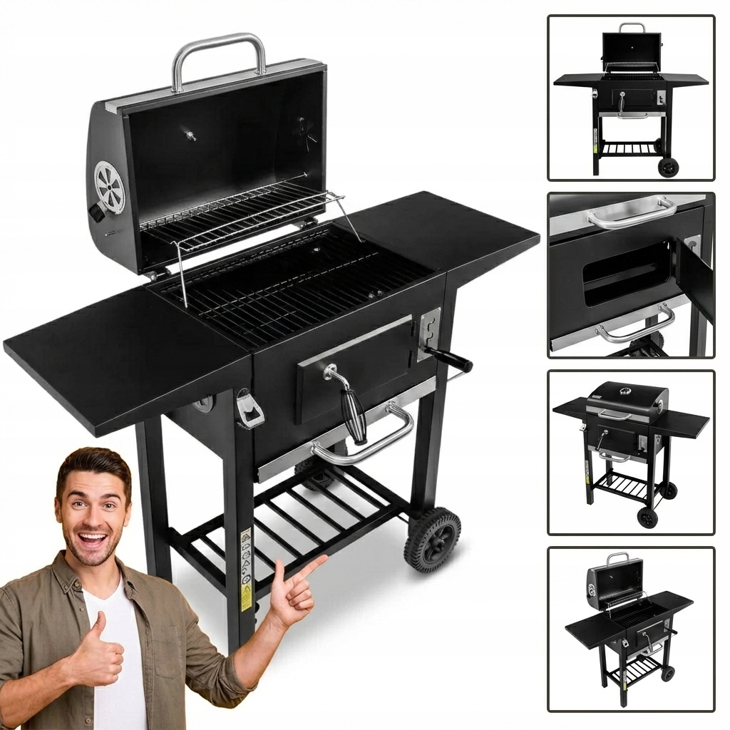 ✅ Dodatkowe wyposażenie – Termometr, popielnik, 2 półki boczne, kółka transportowe