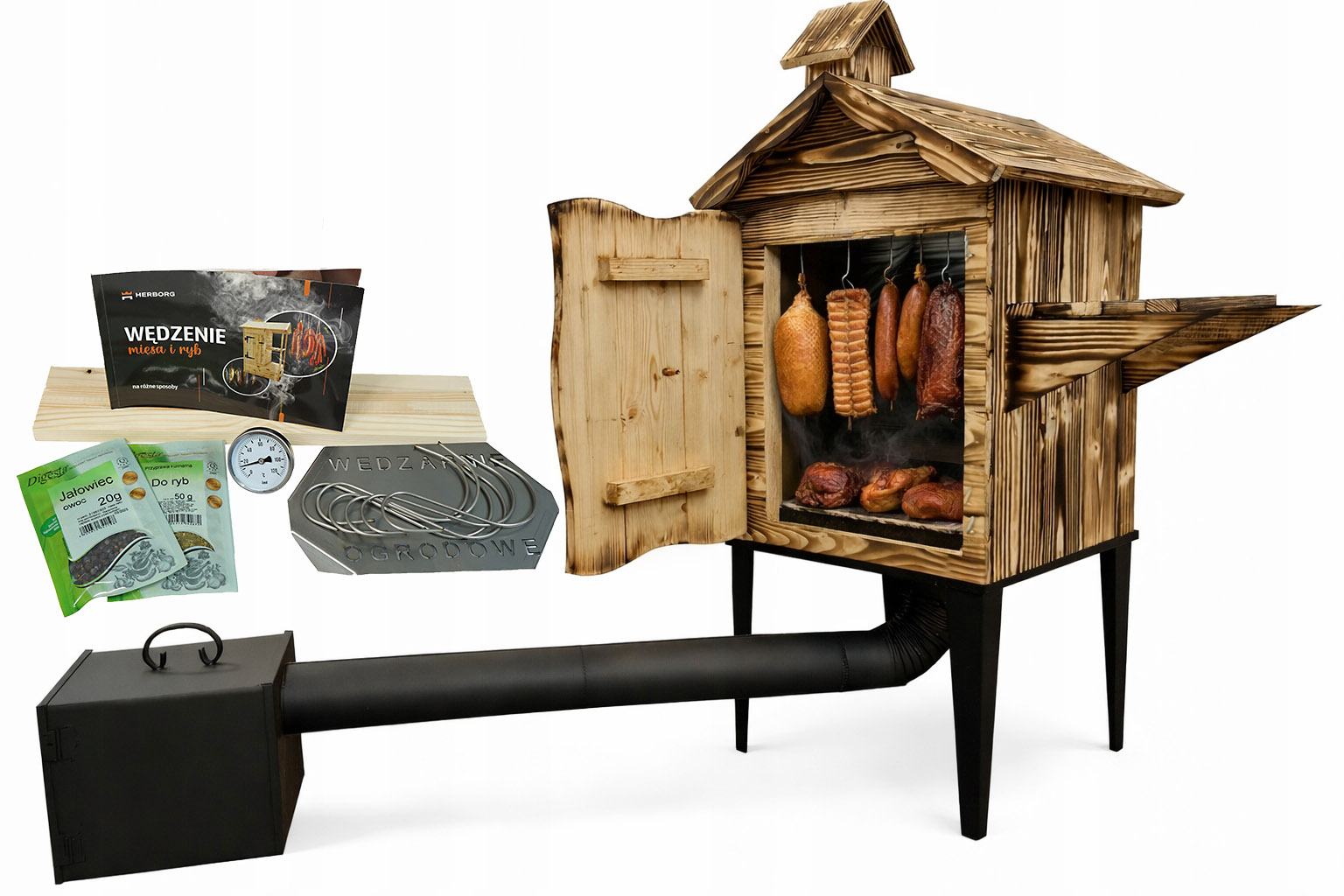 - Książka o wędzeniu: 1 szt., porady + przepisy na mięsa, kiełbasy i ryby