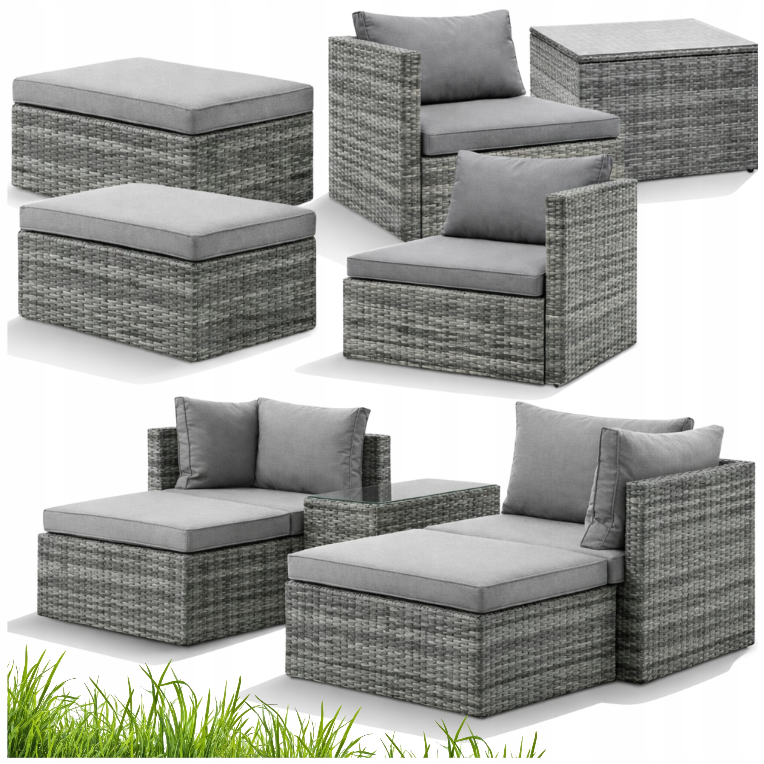 ZESTAW Mebli OGRODOWYCH Narożnik MODUŁOWY Fotel Stolik Podnóżek Rattan Kolor szary